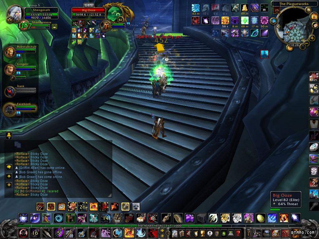 lmao After a tragic wipe on rotface, he somehow started up again before we got back (no, someone didn't douche it up and start it again) and we kited the ooze around the stairwell for around 20 minutes. good times LOL